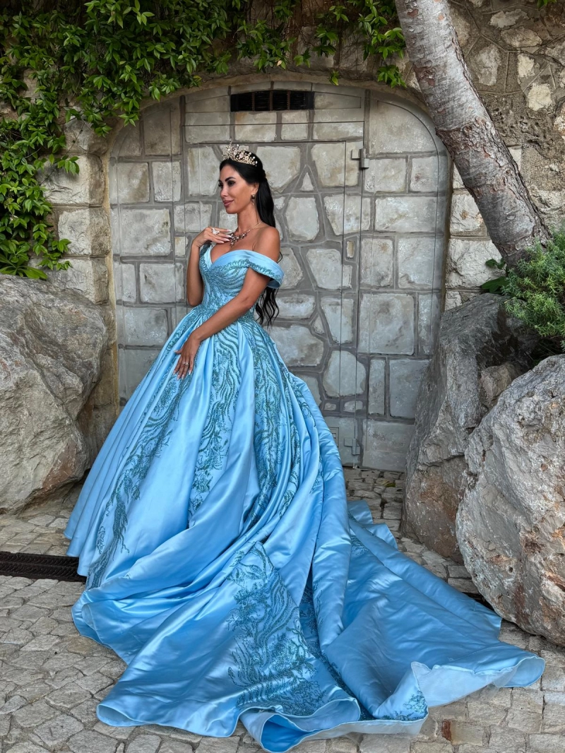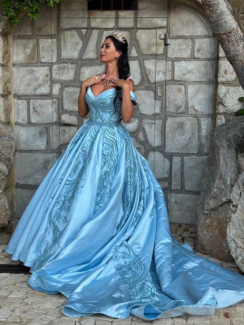 Barbara Bonavita arriva avvolta in un abito celeste impalpabile, firmato Paola D’Onofrio, atelier che conosce l’arte di scolpire la femminilità. La scollatura regale e il movimento della gonna sembrano disegnati per dominare la scena senza bisogno di parole. A incorniciare il tutto, una collana di fiori di luce firmata BL Gioielli Roma, che illumina il décolleté come una costellazione privata.